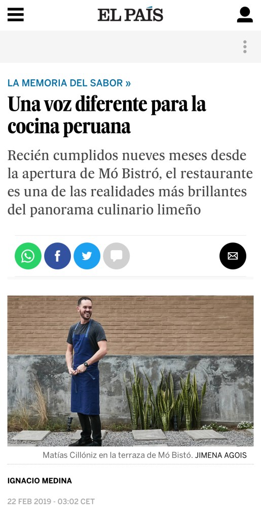 Prensa El País NY Times A la cocina TV con Jose del Castillo “Me gusta mucho lo que está haciendo Matías con esta inquietud por demostrar una cocina más vegetal, menos cargada de proteínas, aprovechando insumos que no comemos” – GQ México «La naturaleza lo ha definido así, y es ella la que rige gran parte de la cocina que practica este joven que hace unas semanas fue elegido por los lectores de El Comercio como ganador del Premio Luces al Mejor Nuevo Restaurante.» – El Comercio “Era una cocina rompedora, bien ejecutada, con técnicas depuradas, una voz propia, que aprovechaban la despensa disponible al máximo y difíciles de encasillar» – Madrid Fusión Comparte esto: Haz clic para compartir en X (Se abre en una ventana nueva) X Haz clic para compartir en Facebook (Se abre en una ventana nueva) Facebook Me gusta Cargando...